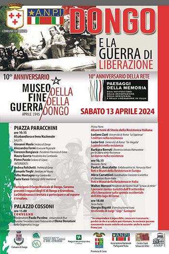 L’evento, nella prima parte, alle ore 10.15, si svolgerà nella centrale piazza Paracchini, con l’alzabandiera, l’Inno nazionale, il saluto del Sindaco di Dongo, Giovanni Muolo, del Sindaco Pietro Puccio e delle altre autorità. Nel pomeriggio, seguirà il convegno a Palazzo Pezzino, dedicato ad alcuni temi della storia della Resistenza: il ruolo dei militari italiani, dei cattolici e delle donne. Nell’occasione, sarà celebrato il X° Anniversario del Museo della Fine della Guerra e presentati i “percorsi storico-turistici dall’8 settembre alla Liberazione sulla sponda occidentale dell’Alto Lago di Como”, inseriti nella Rete dei Paesaggi della Memoria dell’antifascismo e della Liberazione in Italia”.
